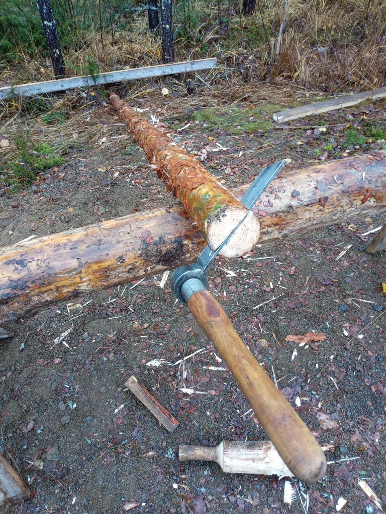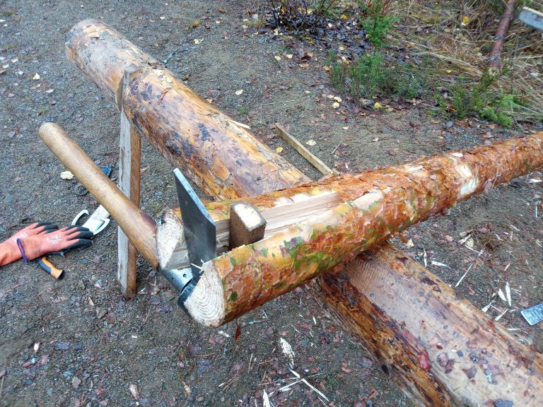 Tukkien latvat varattiin liisteiden tekoon katiskaa varten, mutta oksaisuuden/kierteisyyden ja lämpimän kelin takia päätettiin tehdä vain haljispuolikkaita, joita voitaisiin käyttää mm. perunakuopan kattoon. Maakuntamuseotutkija ja Ossi Närhi halkoivat rungot kirveellä ja teräskiiloilla – Jorma Tella ja Esko Husu petkelekuorivat puolikkaita.